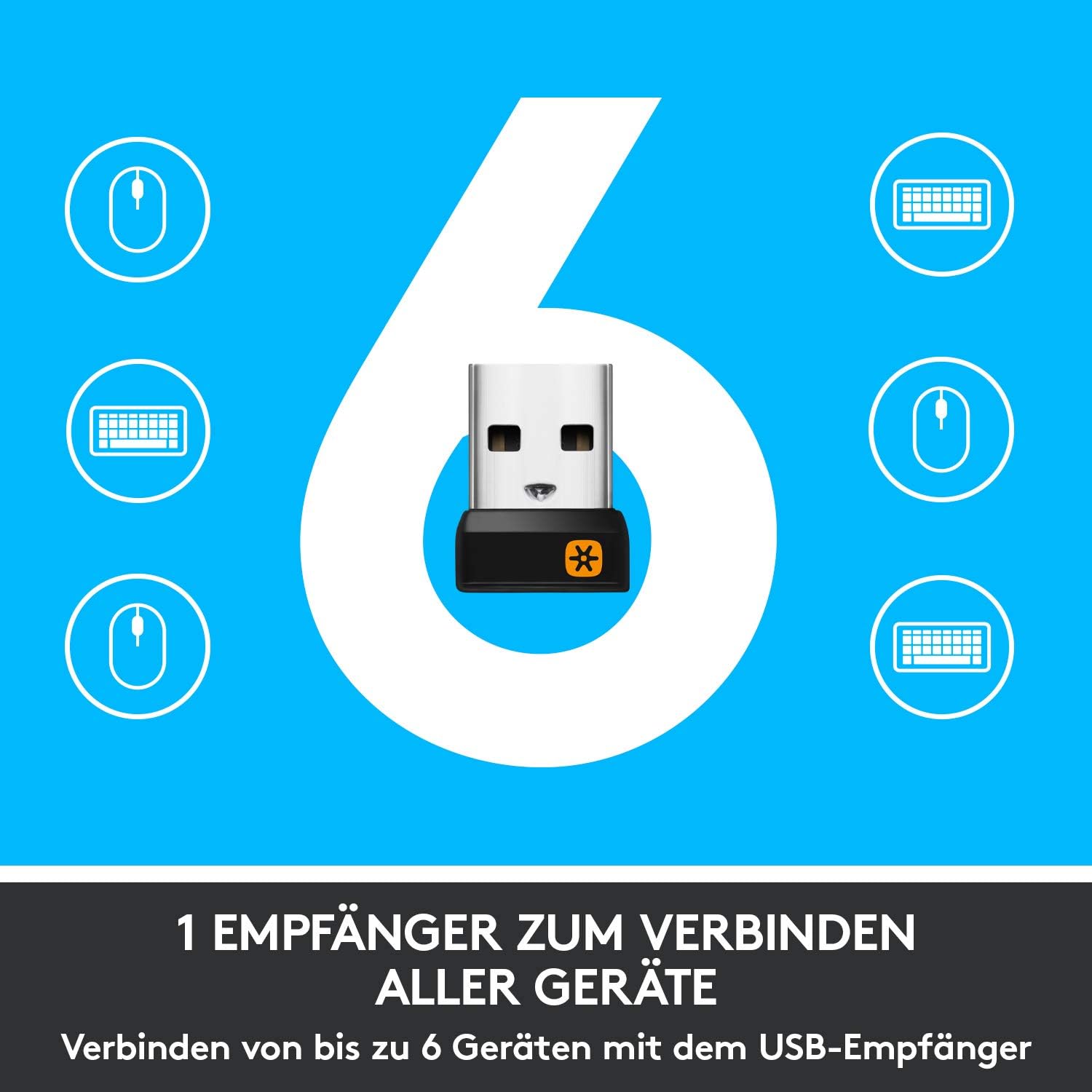 Einfach den kleinen Unifying™-USB-Empfänger in den PC oder Laptop stecken – Tastatur und Maus werden automatisch erkannt, keine Softwareinstallation nötig.